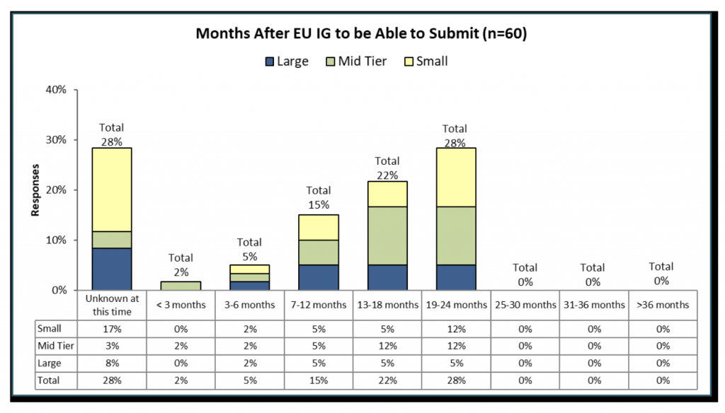 Plus précisément, l’enquête a demandé aux sponsors d’estimer combien de mois après la publication du Guide de Mise en Oeuvre final du 1er tour de l’UE ils comptent pouvoir soumettre à l’EMA des soumissions conformes à SPOR.